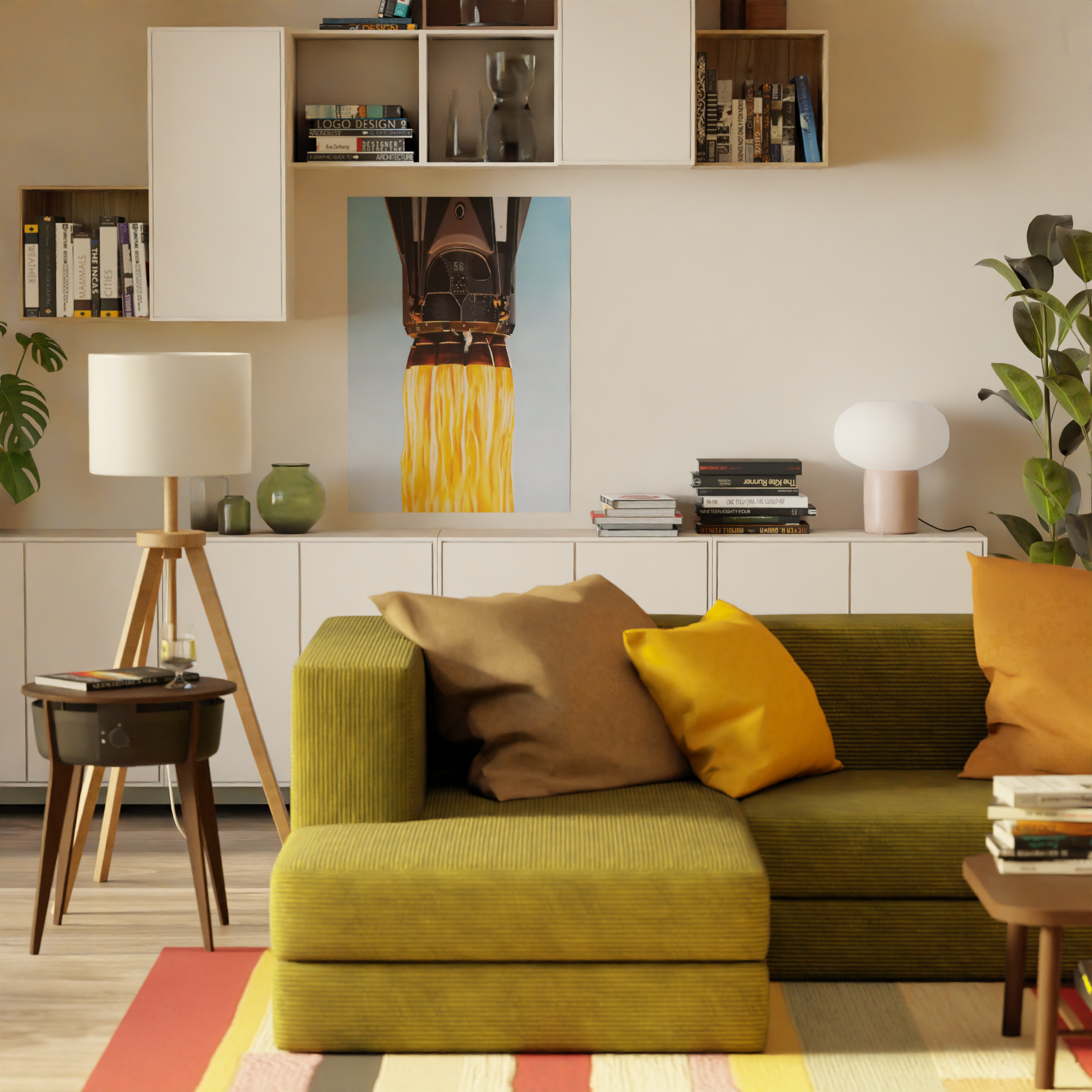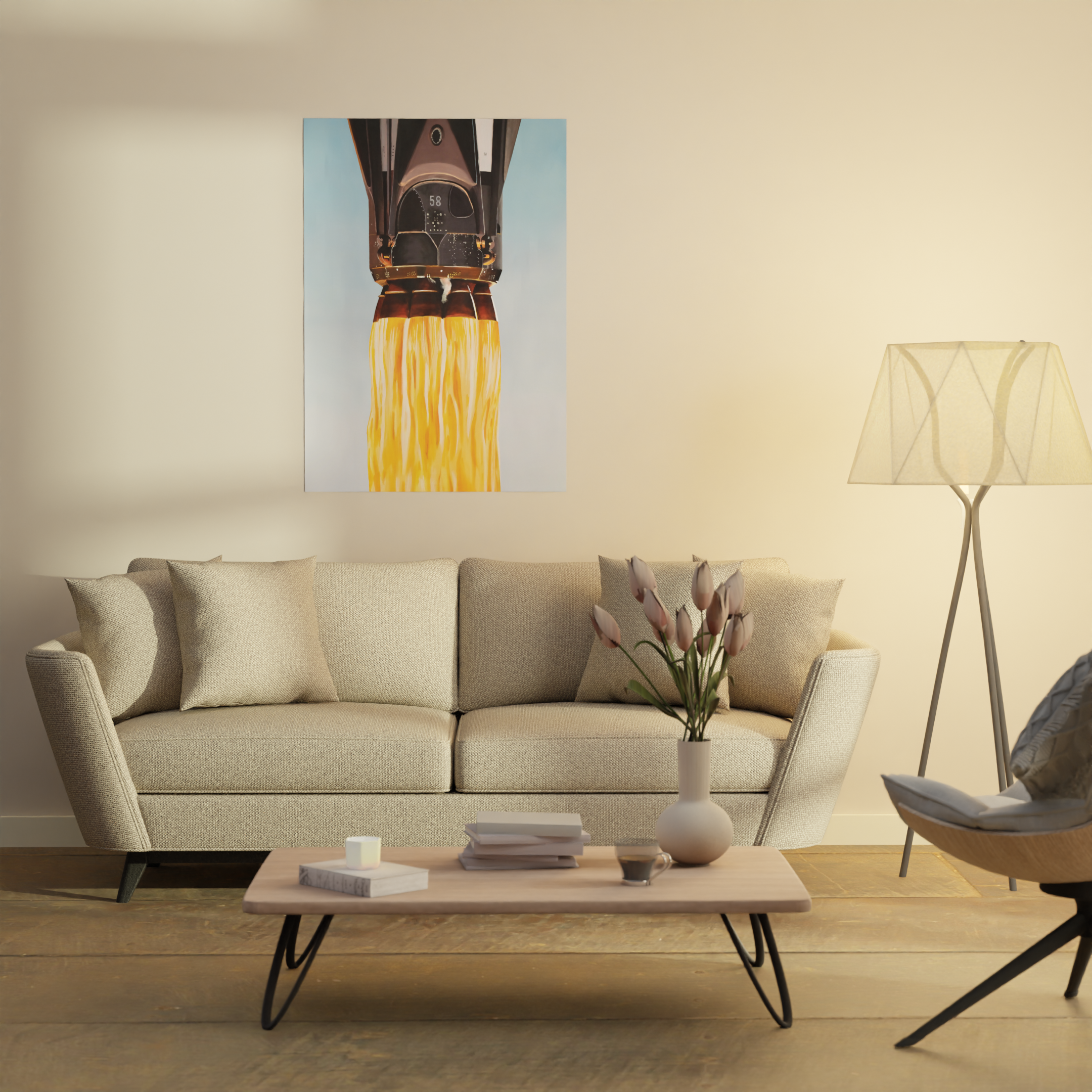 Launch photographers have been good at capturing these engines during launch – and it was those images that inspired me to paint something striking like this. I took my favorite launch photos and stitched them into one mega picture for inspiration. I knew I wanted to keep this painting simple, so I got rid of everything in the background and cleaned up the rocket as much as I could.